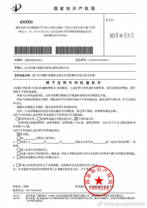 近日,武汉东湖大数据科技股份有限公司申请的“基于标识解析数据的企业安全风险辨识评估方法及系统”被国家知识产权局授予发明专利权,这项突破性技术成功解决了工业互联网标识解析体系在企业安全风险辨识评估方面的应用难题,为数千万企业提供了更加科学、准确的安全风险评估解决方案。